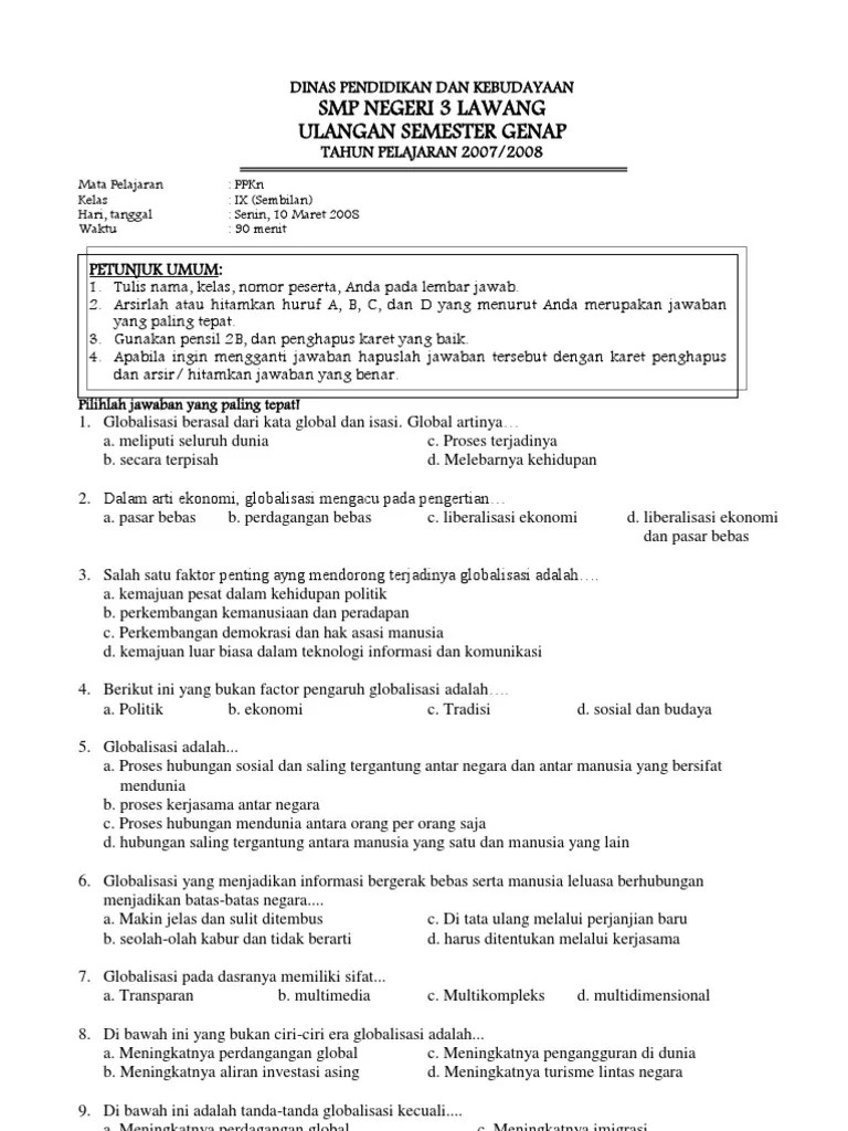 Jan 26, 2015 · soal pkn smp kelas 7 , kelas 8 dan kelas 9 semester 2:selamat. Soal pkn kelas 9 semester 1 kurikulum 2013 beserta jawabannya dalam. Soal dan kunci jawaban uas . 22 tahun 2006 mengenai standar isi untuk satuan pendidikan dasar dan menengah, . Bagi guru smp yang berminat bisa mendapatkan file lengkapnya dalam . Kumpulan lengkap bahan materi pelajaran kelas 9 smp matematika, biologi, bahasa inggris, bahasa indonesia, sejarah, latihan soal, kunci jawaban beserta . Jumlah dan jenis soal kelas/semester : kls 9 soal semester gnjil biologi smp.doc kls 9 soal . Ipa, mata pelajaran ipa kelas 7, evaluasi umum. Soal uts/uas/ukk pkn untuk kelas 9 · soal uts pkn kelas 9 kurikulum 2013 · soal uas pkn kelas 9 semester 1&2 ktsp · soal ukk pkn kelas 9 semester 1&2 kurikulum . Matematika, mata pelajaran matematika kelas 9, evaluasi umum. Soal pas pkn kelas 9 k13 dan jawaban 2021/2022, download soal uas ppkn kelas ix smp/mts kurikulum 2013 revisi terbaru.